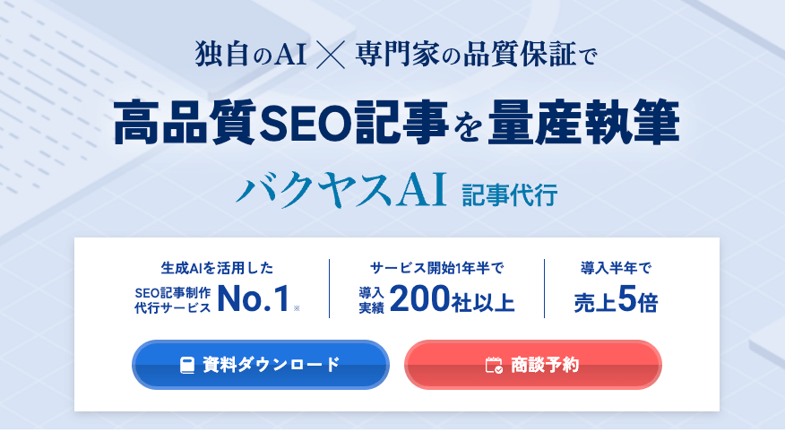 TechSuite株式会社のバクヤスAI記事代行は、独自開発の執筆システムでAIが初稿を生成し、人が最終確認する“ダブルチェック方式”により、安定した品質のSEO記事を大量に制作できる点が強みです。