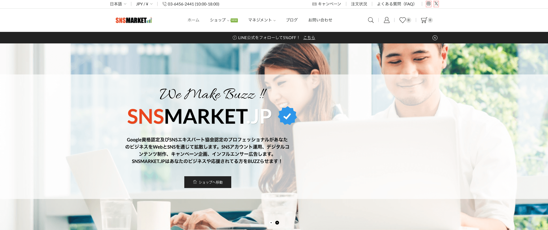 SNSマーケット.jpは、各SNSのフォロワーやエンゲージメント増加サービスの提供と、アカウント運用代行やコンテンツ制作など、フォロ爆以外のサービス提供も行っています。