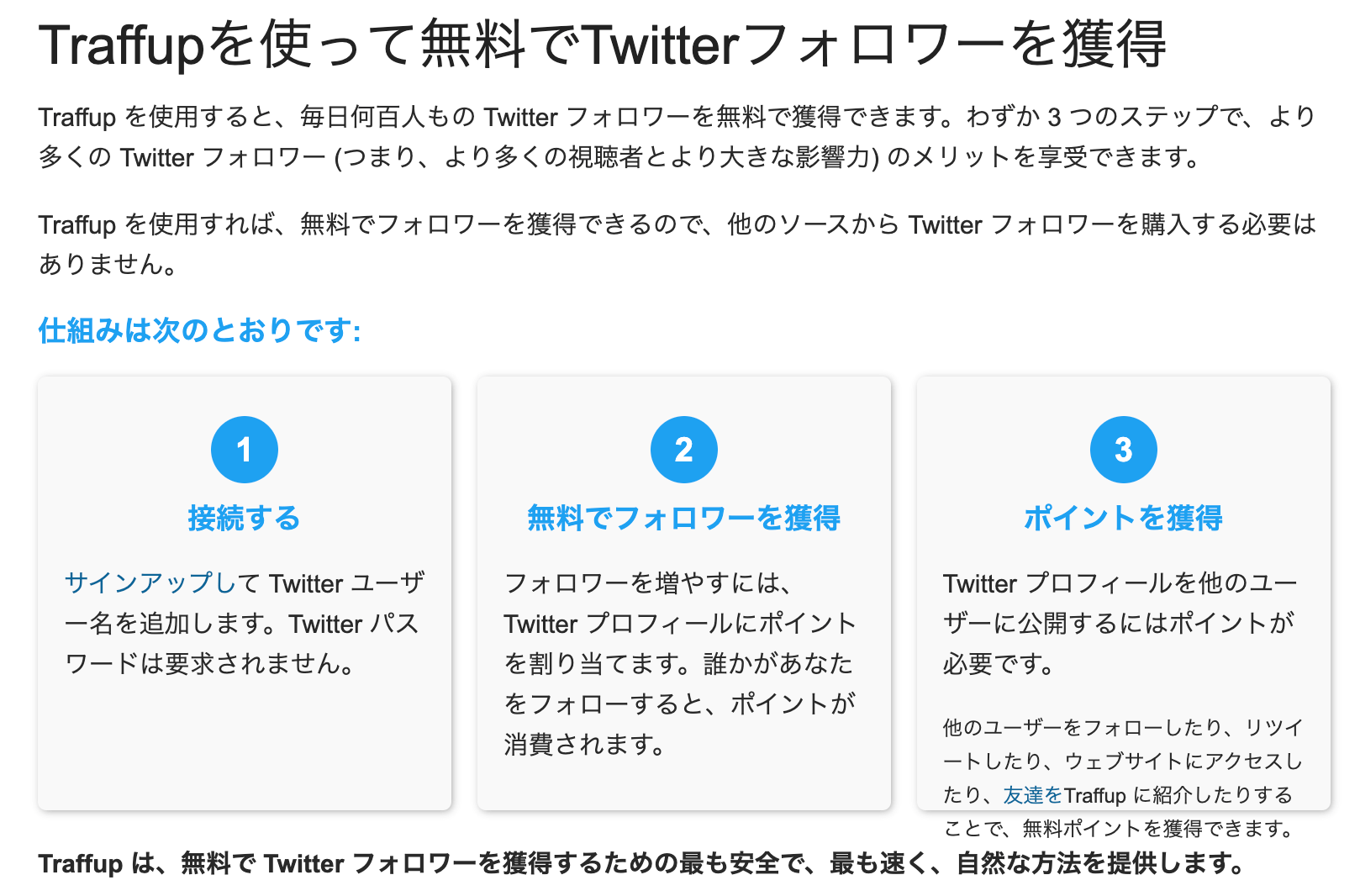 繰り返しですが、traffupは会員同士でフォローしたりサイトにアクセスするサービスです。以下はtraffupの説明ページを日本語訳したものとなります。